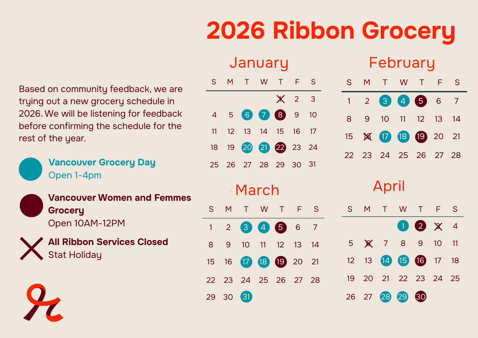 People living with HIV can access Ribbon Grocery in Vancouver or Surrey. To register for our Vancouver location, community members can connect with our case managers by phone (604-893-2201) or in-person during our drop in hours, typically 10am - 4pm Mondays through Thursday. Ribbon Community is closed during stat holidays.