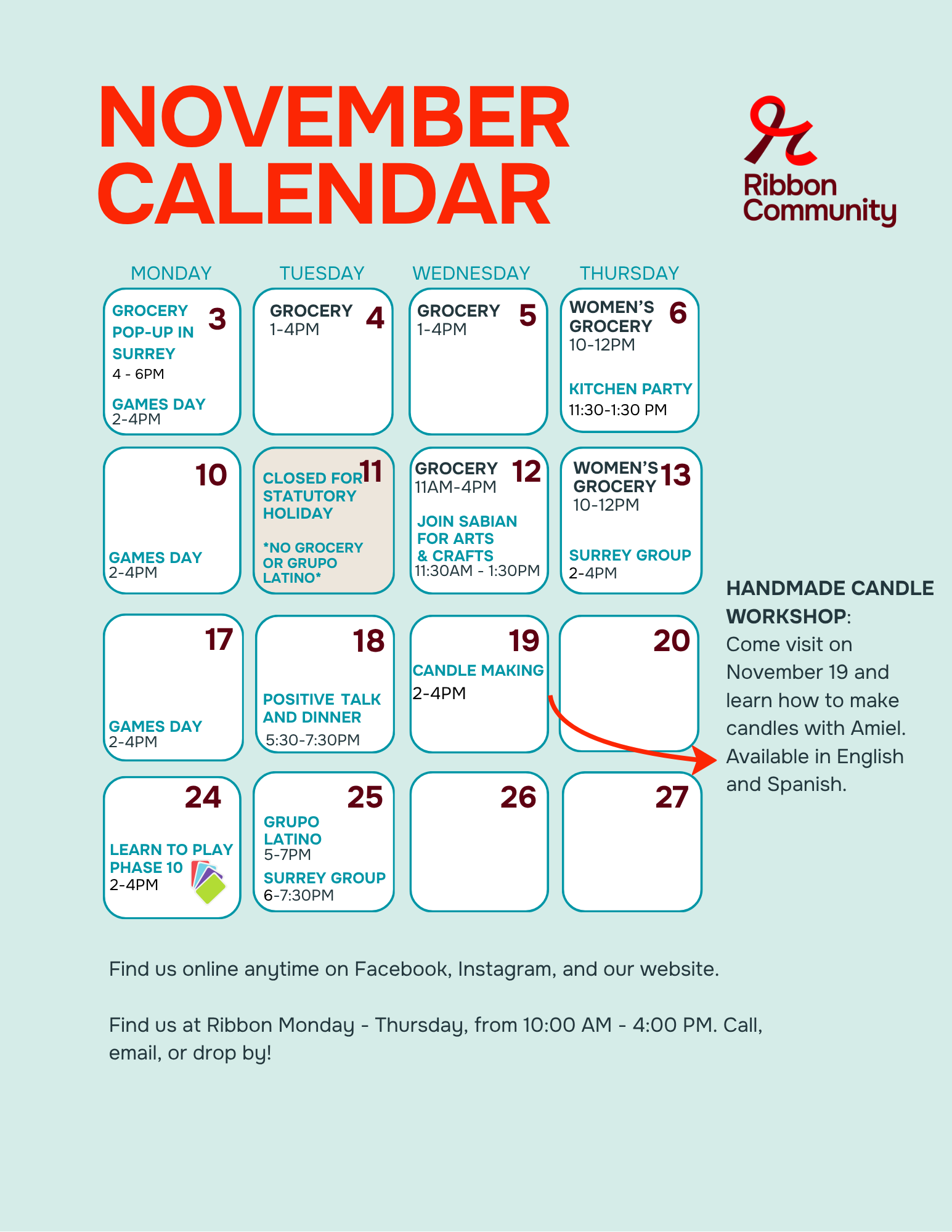 *** Please note Ribbon Community and our peer offices at Positive Health Services, John Ruedy Clinic, and Oak Tree Clinic are closed on Tuesday, November 11, for the statutory holiday. Ribbon Community Grocery in Vancouver is open extended hours on November 12, from 11am - 4pm in wake of this closure.